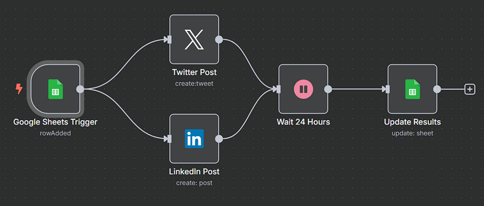 Let’s see an example of a N8N workflow that automatically posts to Twitter and LinkedIn when you add content to a Google Sheet, then track engagement and save results back to the sheet.